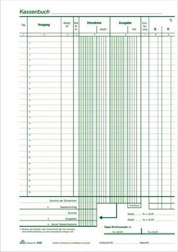 Im Kassenblock werden alle Kassenbewegungen (Einnahmen und Ausgaben) mit Vorgangsbezeichnung, Belegnummer, Betrag und Zuordnung der Buchung zu einem Buchungskonto (Kontierung) erfasst. Mit Seitenaufrechnung und Berechnung des neuen Kassenbestandes. Mit Beispielbuchungen. 1. Blatt weiß perforiert, 2. Blatt gelb perforiert.