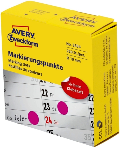 Markierungspunkte auf Rolle. Werkstoff: Papier. Stabiler Kartonspender zum sauberen Aufbewahren. Durchmesser: 19 mm. Farbe: magenta. Anzahl Etiketten (Rolle/Packung): 1/250 Stück.